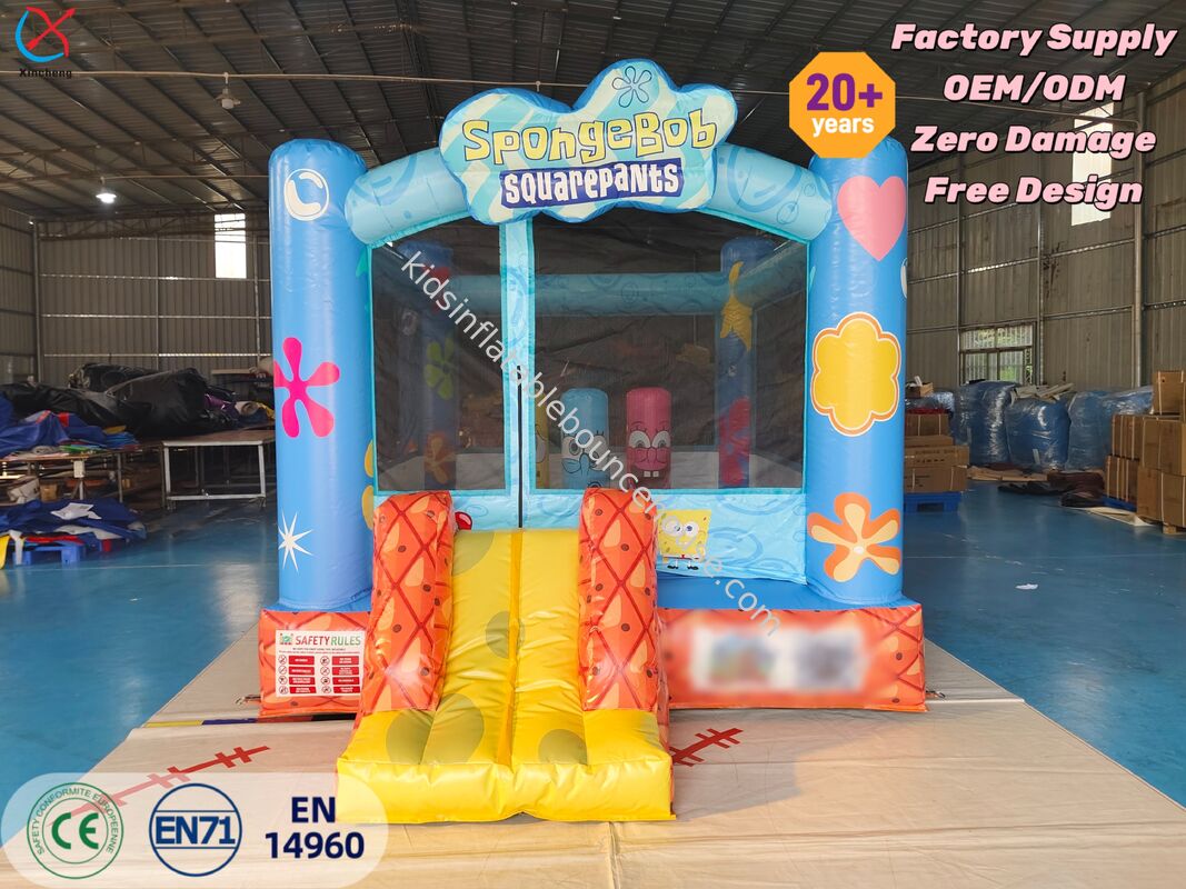 Esta casa de salto inflable con el tema de Bob Esponja tiene diseños animados vibrantes y una diapositiva adjunta, dando vida al mundo submarino de Bikini Bottom para el entretenimiento de los niños.